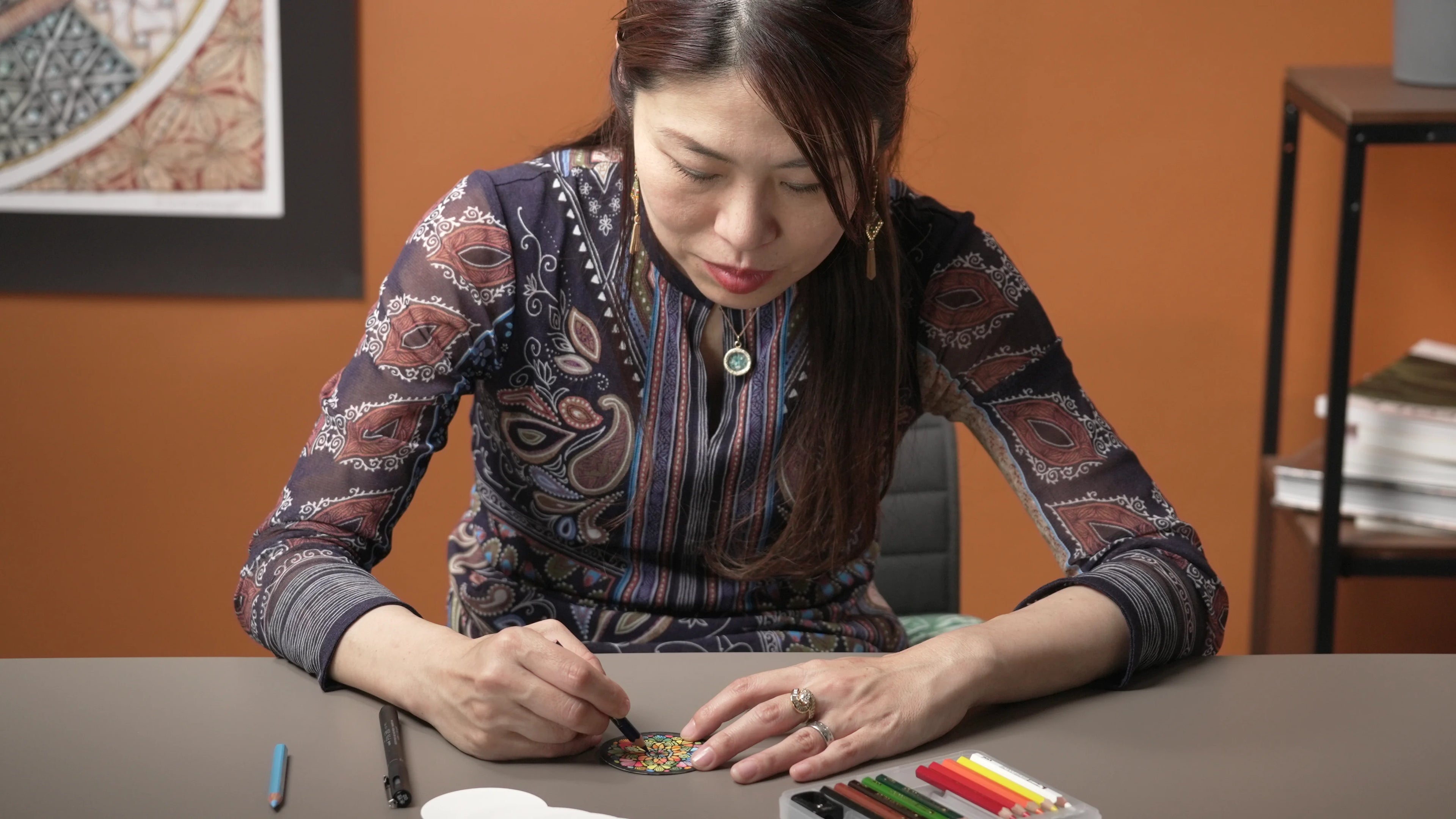 成富史絵先生が講師ということで受講を決めました。これまで独学でゼンタングルを描いていましたが、今回はマンダラ風で、色を使うことも苦手で不安でした。しかし、先生の教え方はとても分かりやすく、私でも勉強になる色合わせを学ぶことができました。完成した作品にも大変満足しています。とても楽しい時間を過ごせました。ありがとうございました。